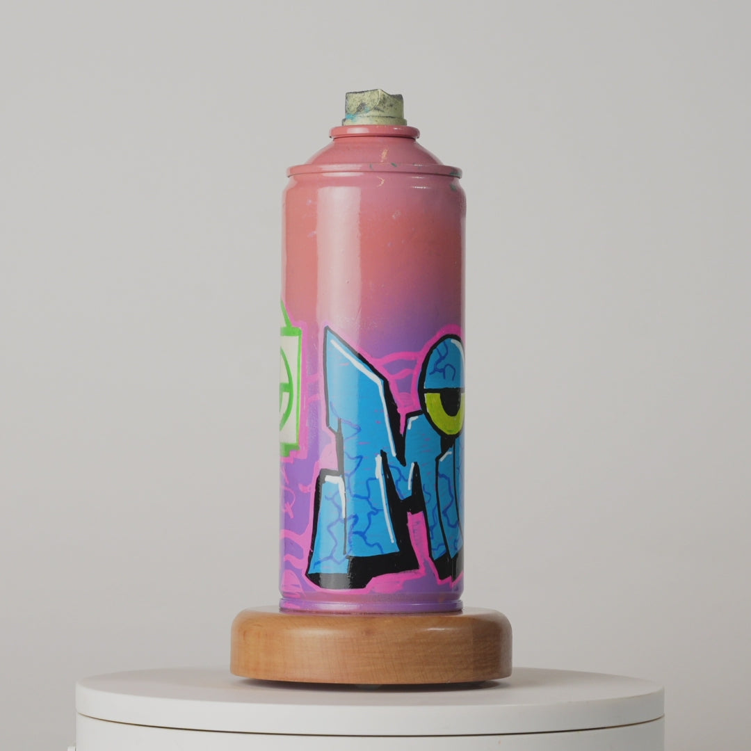 One of just 5 pieces in the Second Edition of the 1000 Cans Project. This spray can is hand-painted with "MiG" graffiti letters, featuring a glow in the dark robot character and mounted on a solid wood base.
