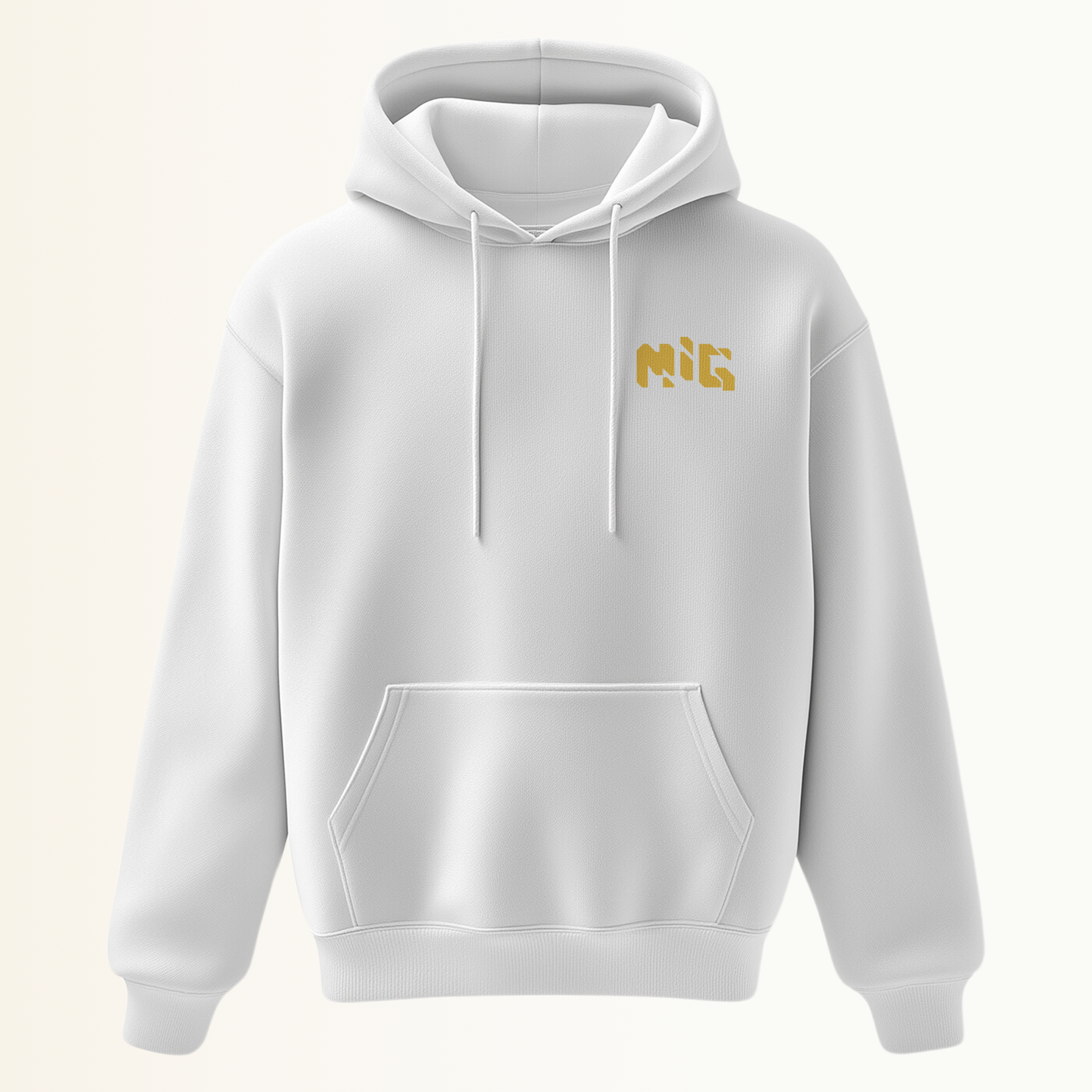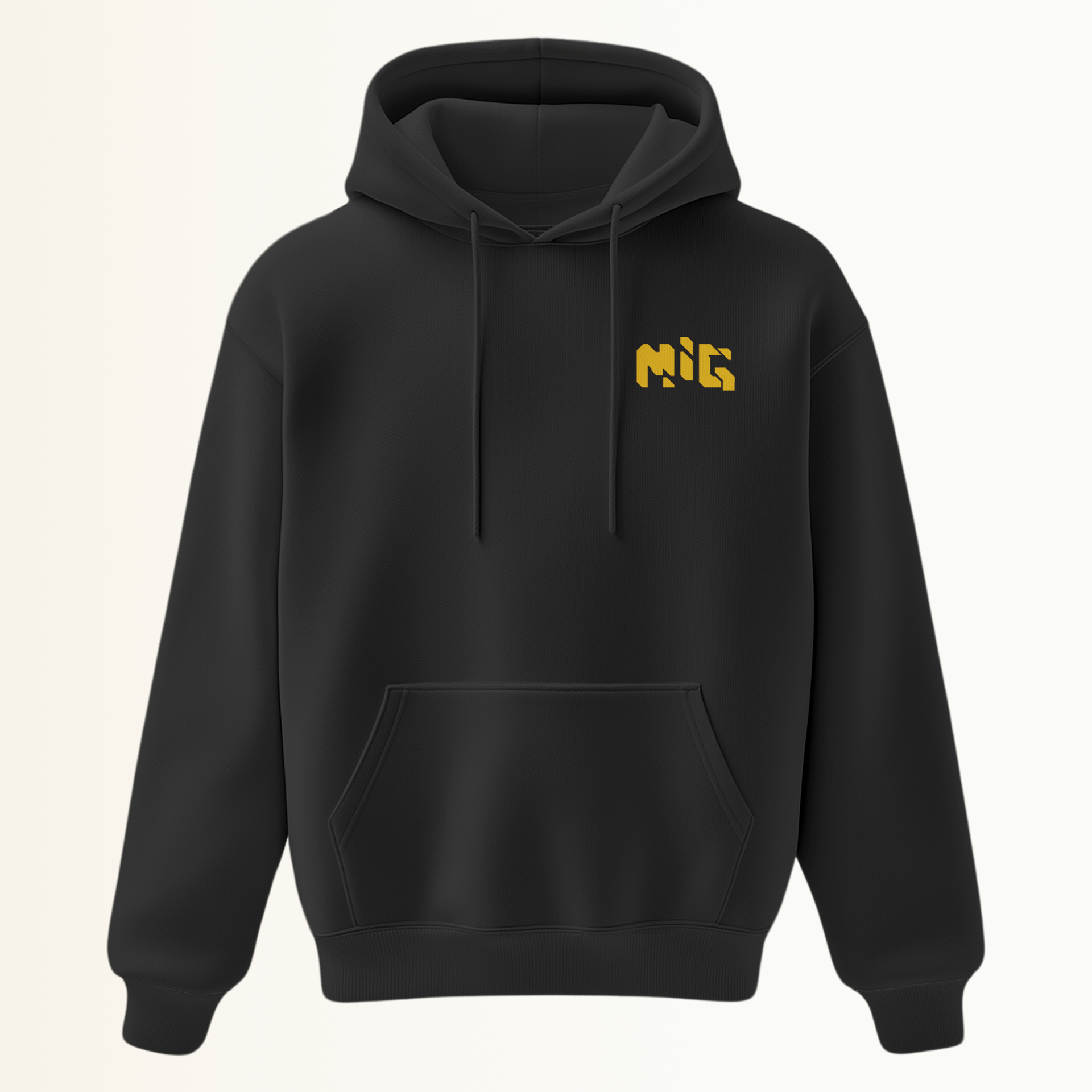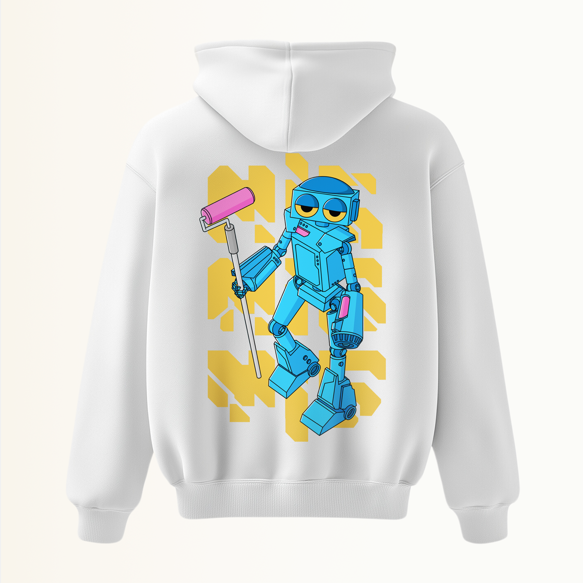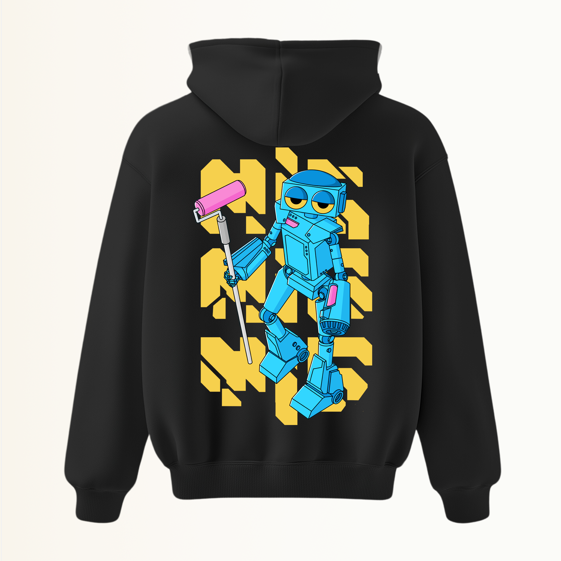 Cyberpunk-inspired hoodie showcases a bold, oversized print on the back featuring a full 3D design of the robot character in action, marching with a paint roller. The front features cyberpunk-style MiG typography for a sleek, futuristic touch.