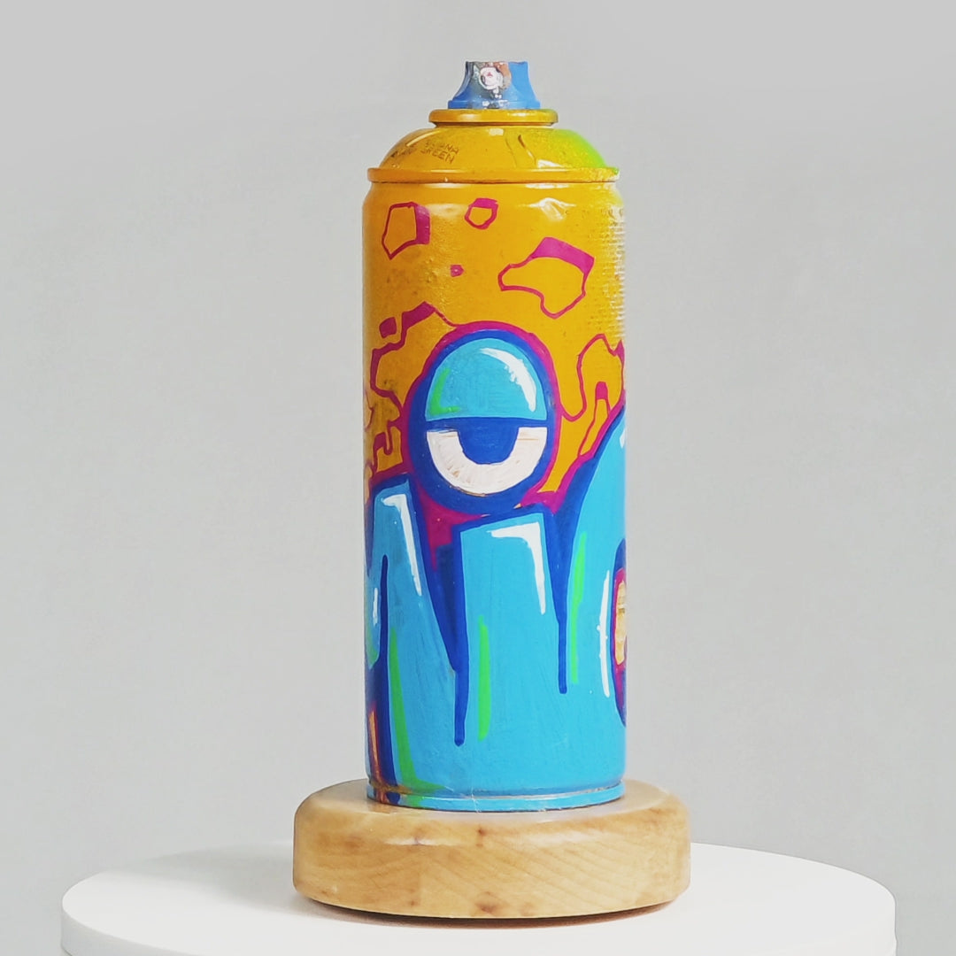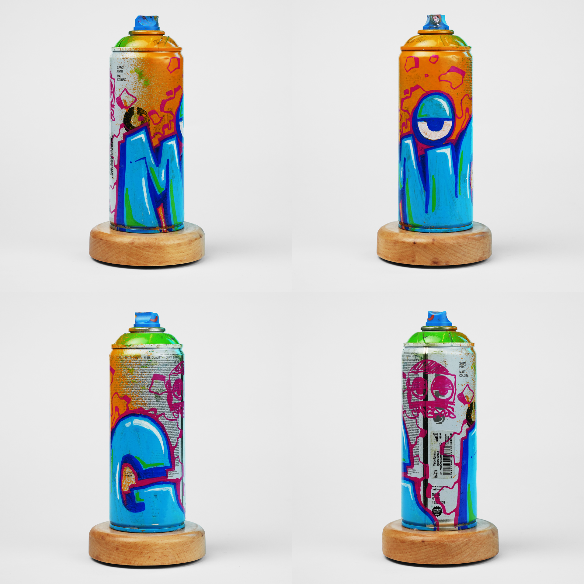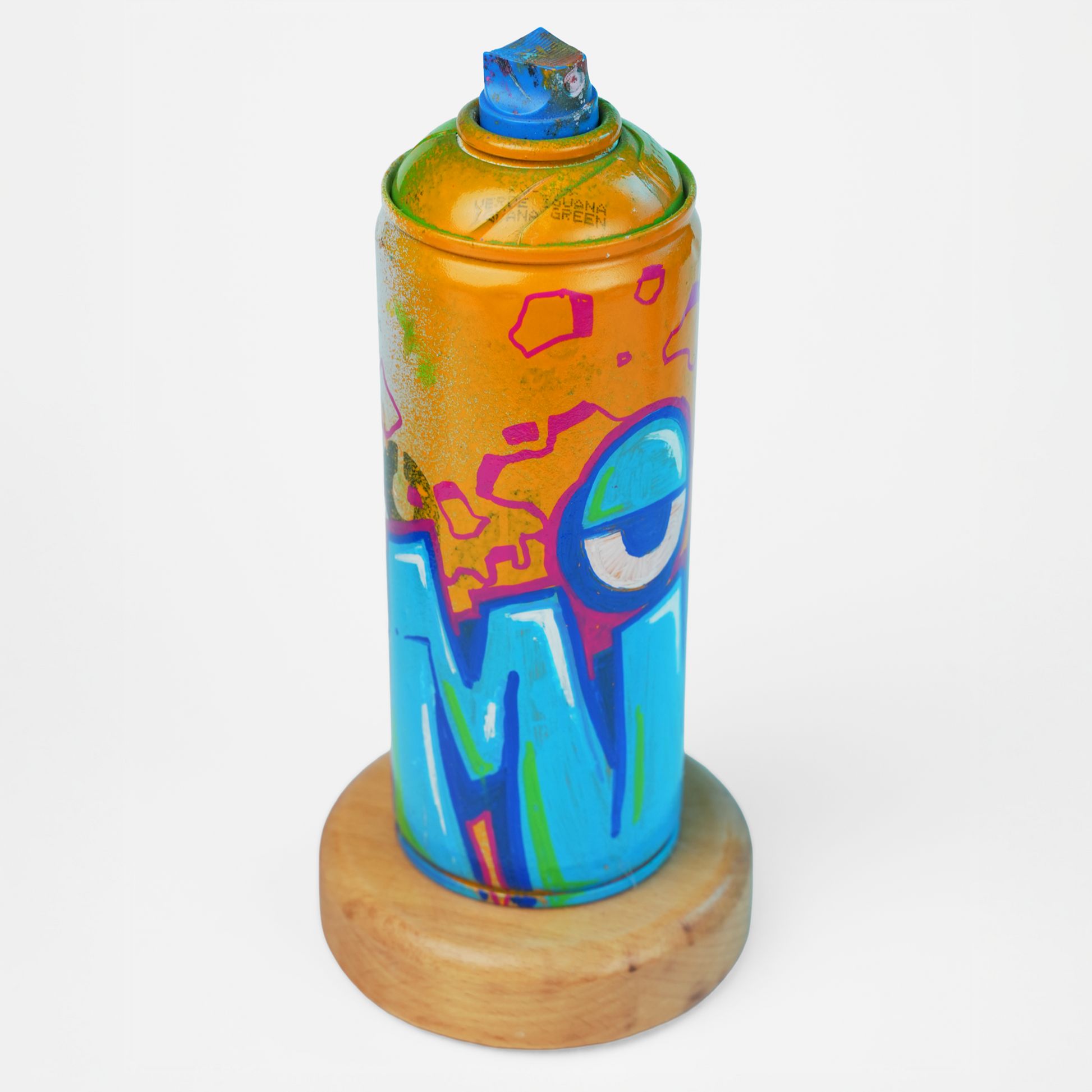 One of just 6 pieces in the First Edition of the 1000 Cans Project. This spray can is hand-painted with "MiG" graffiti, featuring blue and orange color scheme. It's sealed with a clear coat and mounted on a solid wood base.