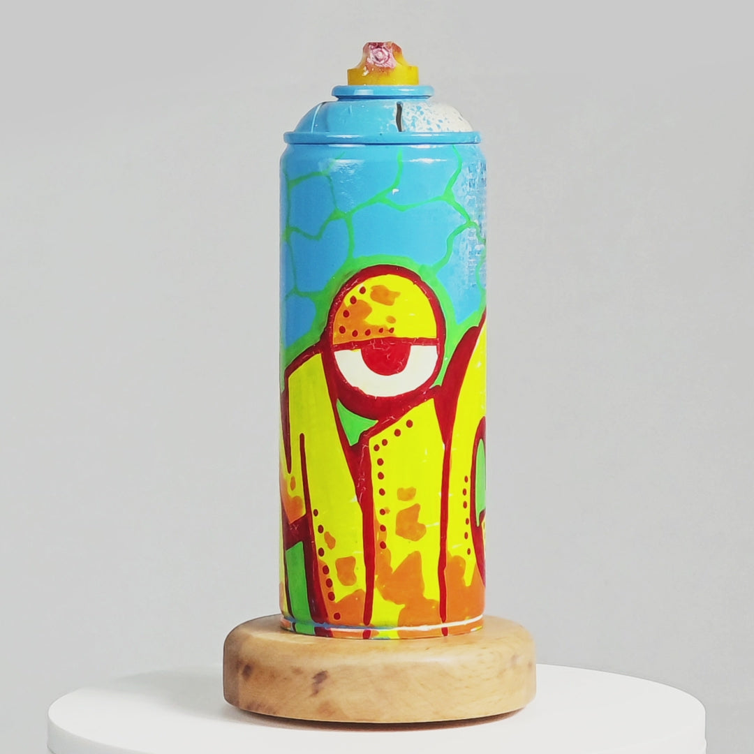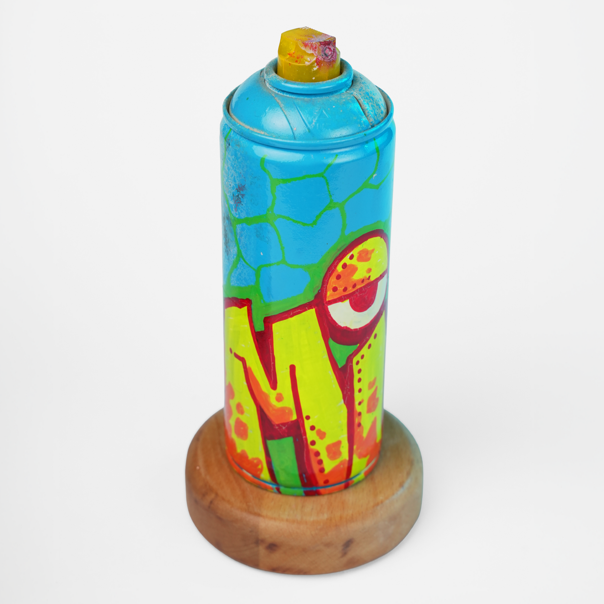 One of just 6 pieces in the First Edition of the 1000 Cans Project. This spray can is hand-painted with "MiG" graffiti, featuring vibrant blue and yellow color scheme. It's sealed with a clear coat and mounted on a solid wood base.
