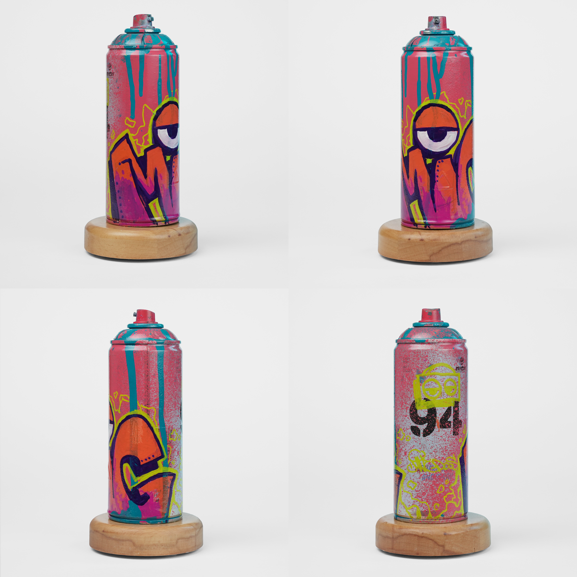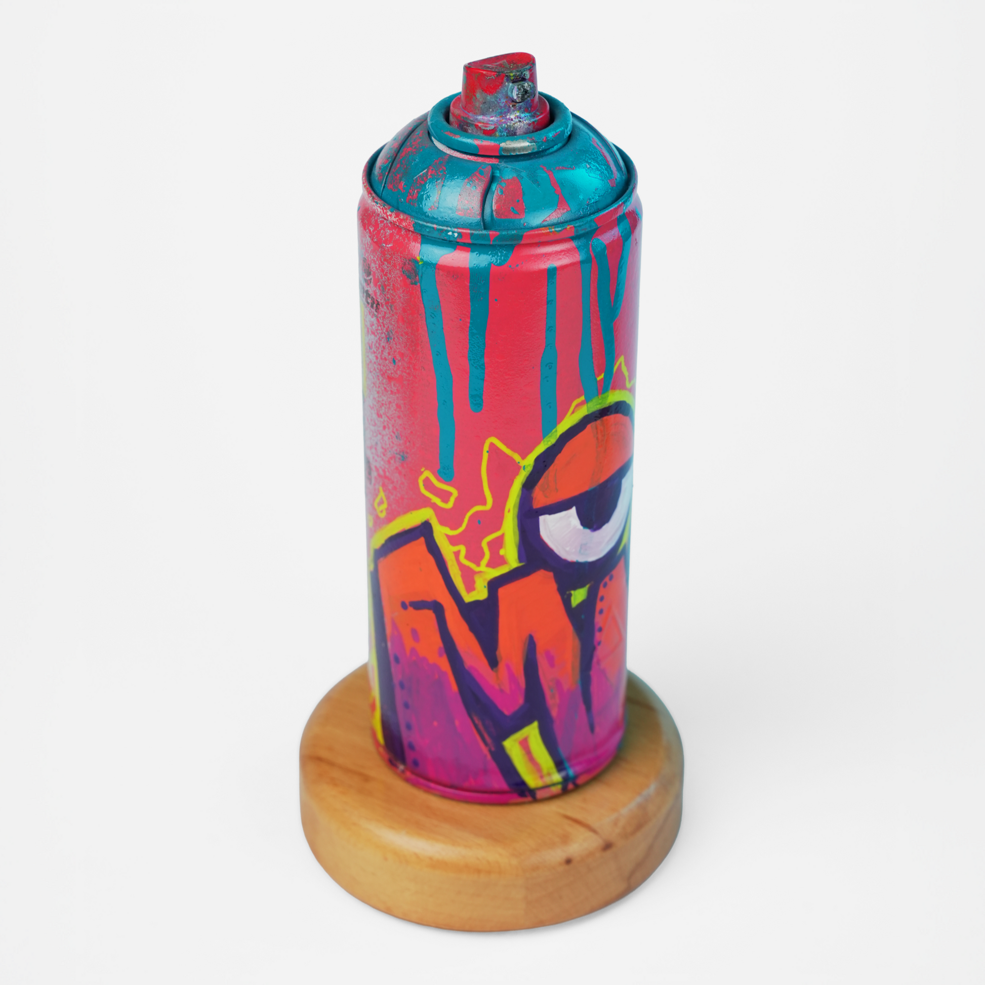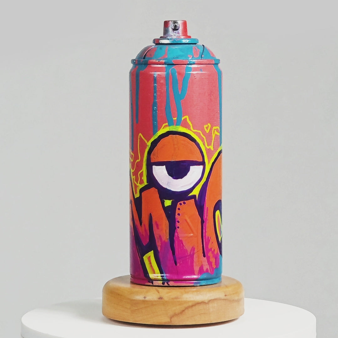 One of just 6 pieces in the First Edition of the 1000 Cans Project. This spray can is hand-painted with "MiG" graffiti, featuring vibrant pink and orange color scheme. It's sealed with a clear coat and mounted on a solid wood base.