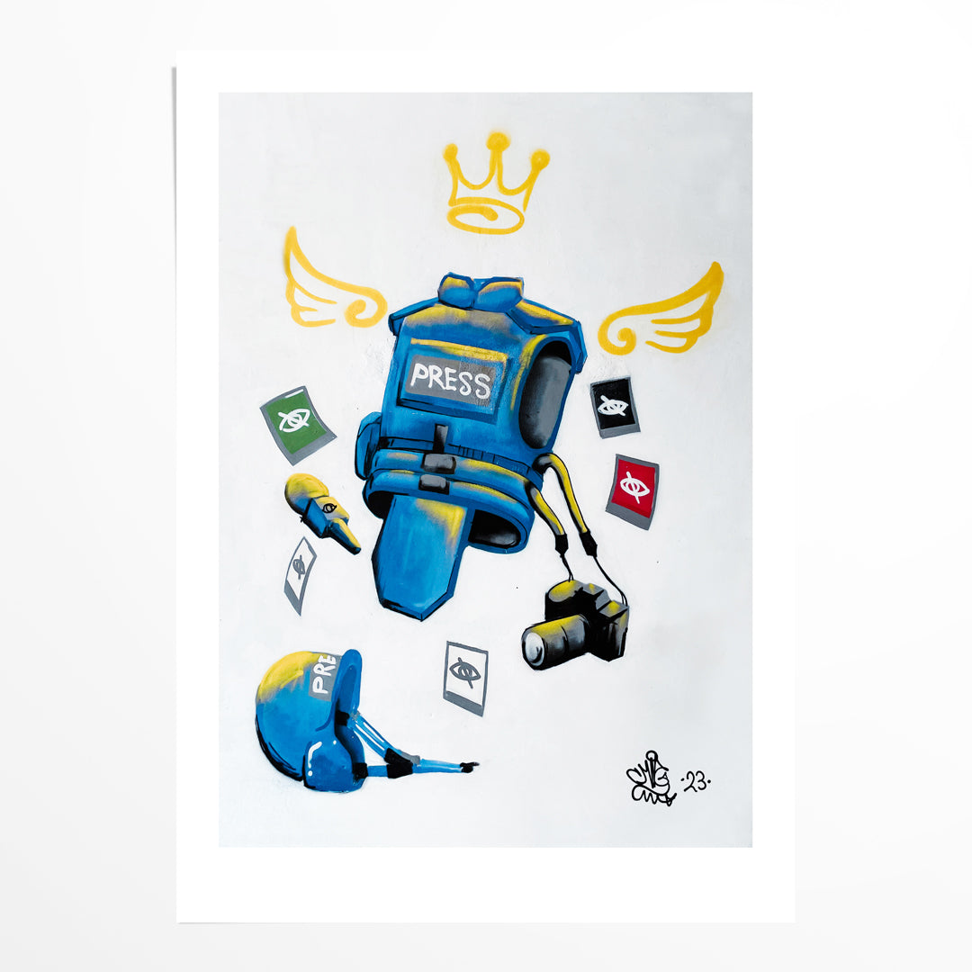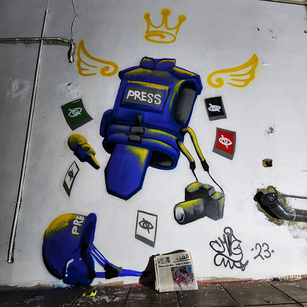 Rest In Press is a tribute to the journalists targeted by the IOF in Gaza. The mural depicts a levitating blue press vest with golden wings and a halo, honoring their sacrifice.
